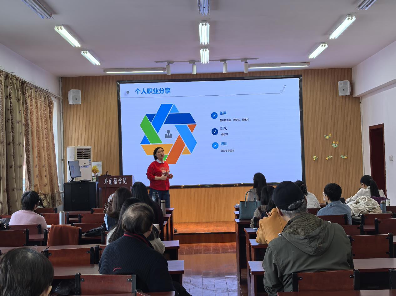 在个人职业分享环节,赵霞老师结合自身丰富的教学经验与职业历程,同在场教师深入交流,分享了她在教学方法创新、课程设计优化、学生个性化培养方面的心得体会,为公共外语教学系教师提供宝贵借鉴。她依据在校支教经验,强调了“备考核要求”的重要性,即制定清晰明确的考核评价方式。同时,她提醒老师们开学前要“备学生”,提前了解学生的学习情况和需求,并且要“备教材”,充分准备教学内容。