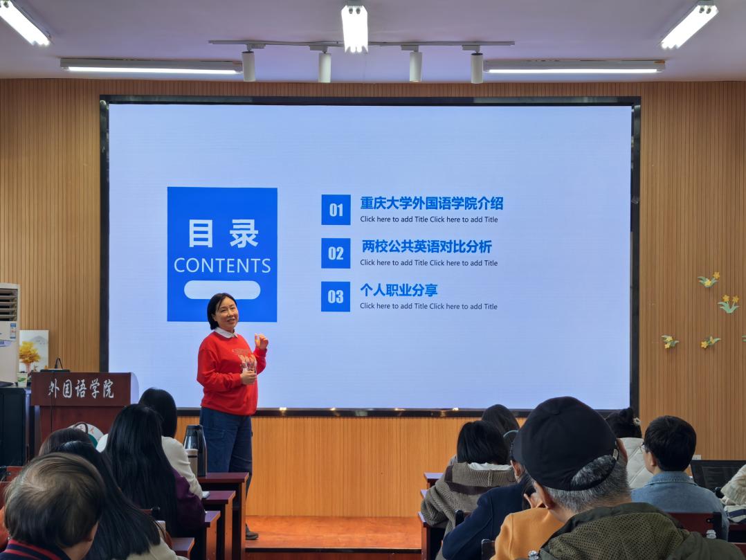 讲座中,赵霞老师首先介绍了重庆大学外国语学院的基本情况,包括学院的发展历程、师资力量、专业设置以及教学成果等,使在场教师对重庆大学外国语学院有了全面深入的了解。随后讲述了两校公共英语的对比分析及个人职业分享。